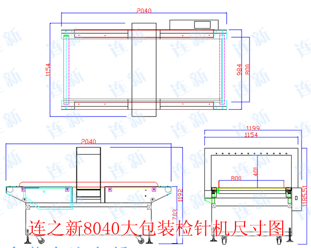 功能特点:连新牌DN-8500-II8040型大包装箱输送式检针机是一款专门定制用于检测整包鞋垫鞋材的大包装验针机,以及可用于检查玩具、服装、制鞋、化工、皮革、针织、塑胶制品等较大、重包装需要检测铁磁性金属杂质的行业,用于检测夹杂或失落于原料或产品中的针、钉子、螺丝、刀片、工具、铁丝等金属异物。能对手袋及印染行业的颜料效应选择均衡功能进行排除。也可用于食品加工企业需要排除铝泊包装只对铁磁性金属的检测。